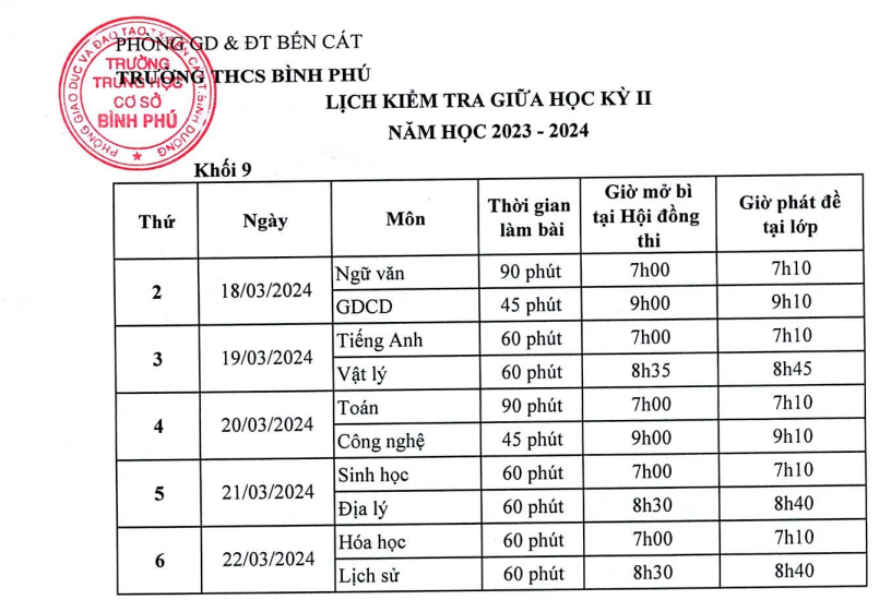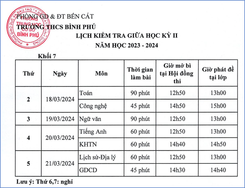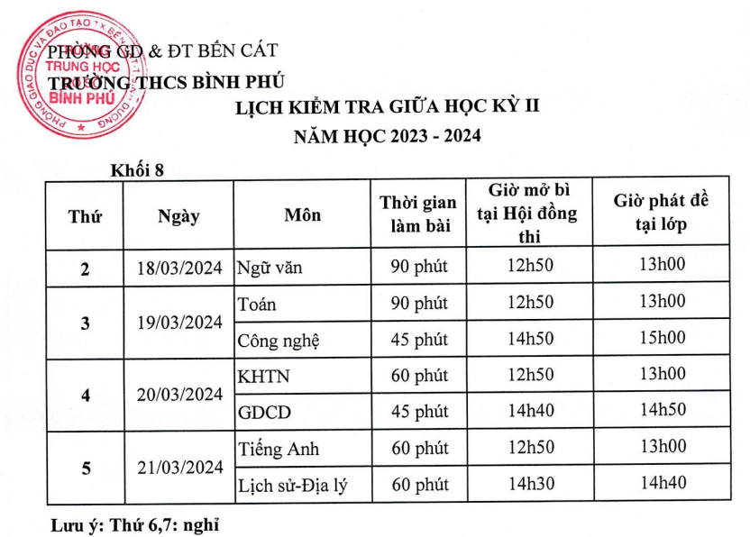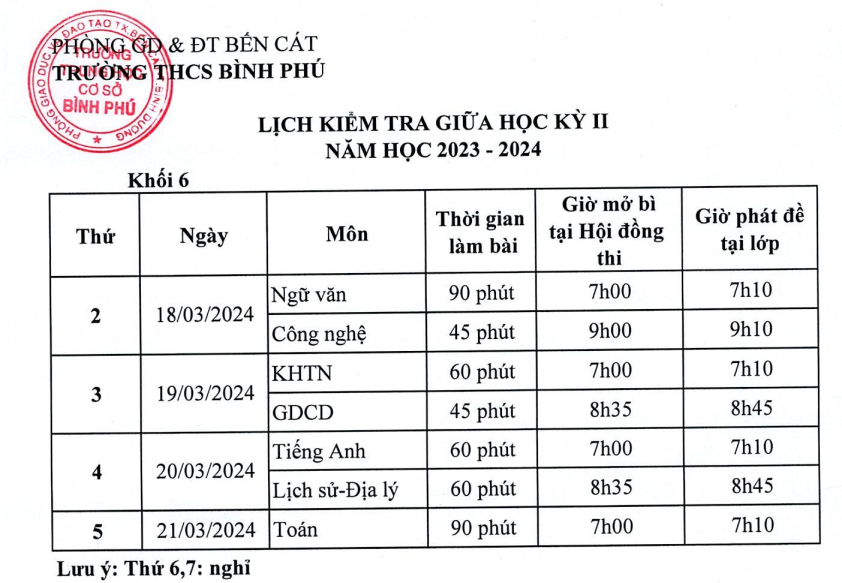 Trường THCS Bình Phú thông báo lịch kiểm tra giữa kì II năm học 2023 - 2024.
